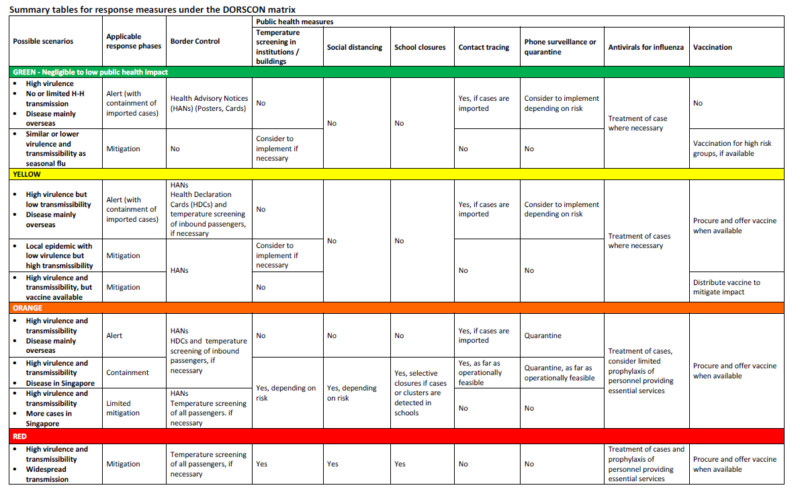 - Singapore Ministry of Health Readiness and Response Plan for Influenza and Other Acute Respiratory Diseases (Revised April 2014) as well as the DORSCON Matrix